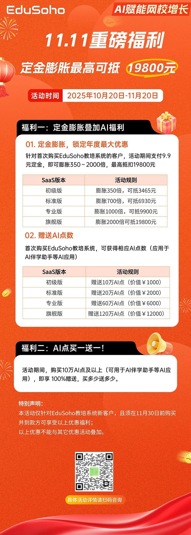 如今,AI 正深度重塑网校的教学与服务模式,让教育机构的获客、教学、留存效率全面升级。值此关键节点,EduSoho 教培系统推出AI 赋能网校增长双十一重磅福利,助力网校机构解锁 AI + 网校的增长新可能!