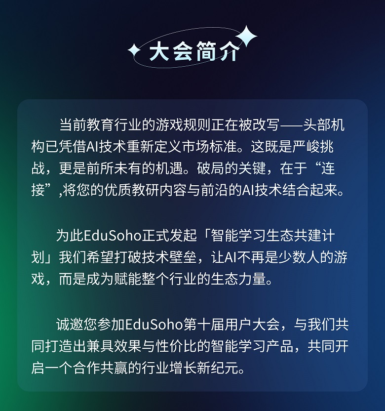 基于这种背景,EduSoho发起「性价比革命:AI驱动教培增长新纪元」为主题的第十届全球用户大会,诚邀各位教育伙伴共同打造出兼具效果与性价比的智能学习产品,开启一个合作共赢的行业增长新纪元!