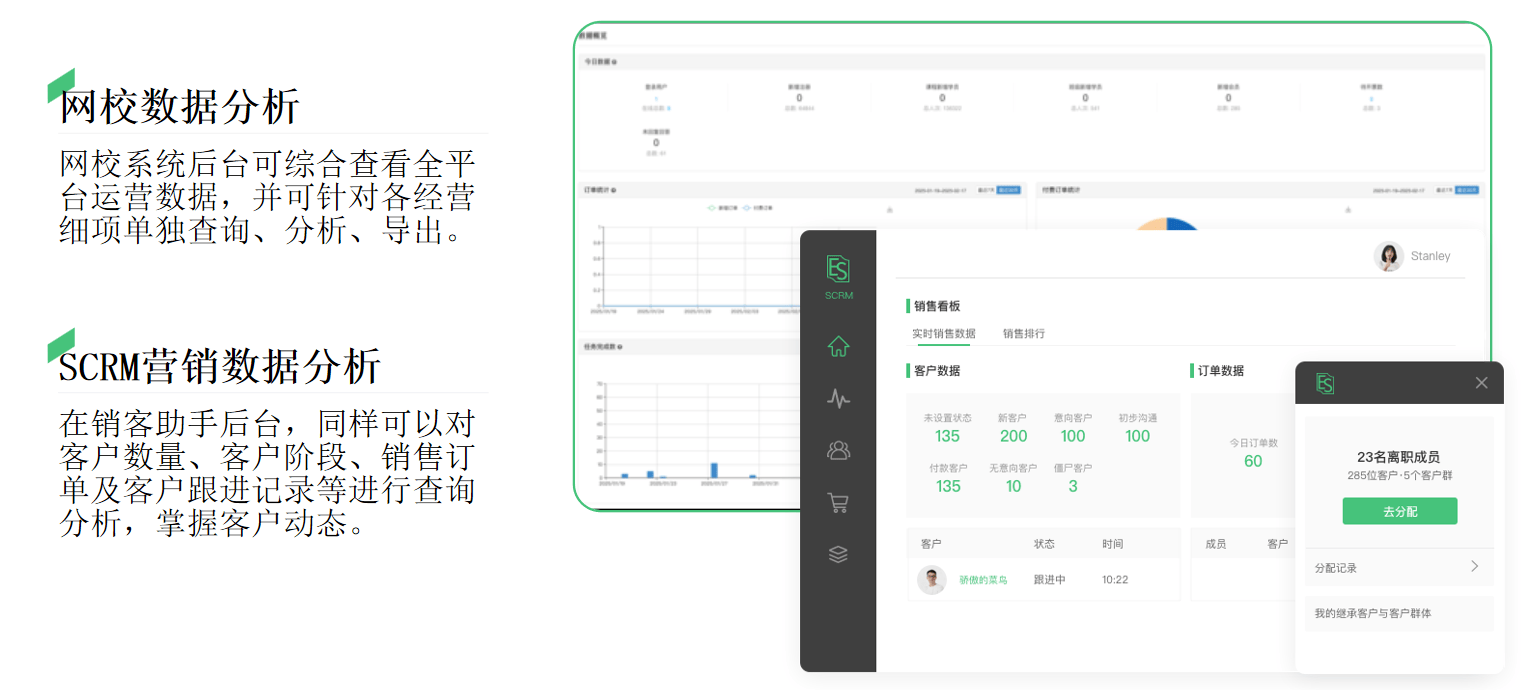 在企业数字化转型的蓝图中,网校系统不应是一个数据孤岛。EduSohoAI 提供了完善的 API 接口文档和 SDK 开发包,具备极强的“连接力”。它可以轻松地与机构现有的 CRM(客户关系管理)、ERP(财务系统)或 OA(办公自动化)系统打通。这意味着,销售在CRM中的录单可以自动开通网校课程,学员的学习进度数据可以回传给教务系统,财务数据也能实时对账。