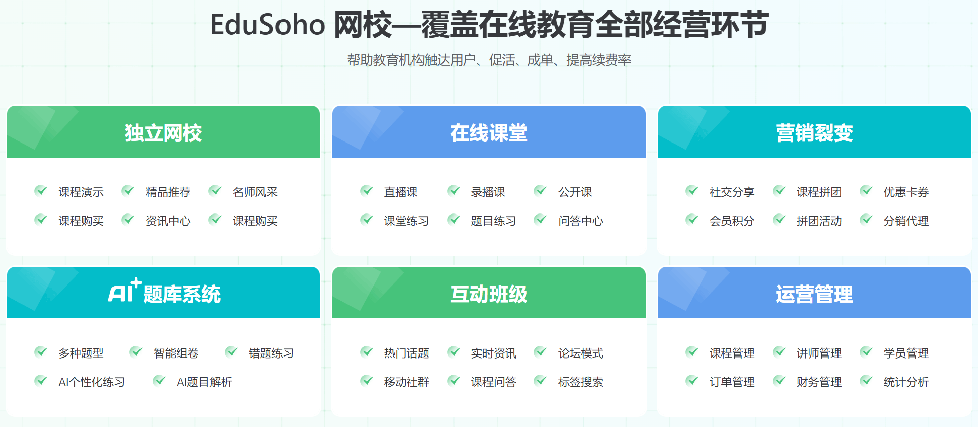 技术永远是服务于教育本质的手段,但在这个数字化时代,技术也是决定教育服务上限的关键。对于教培机构的掌舵人而言,选择 EduSohoAI 进行网校搭建,本质上是选择了一条通往智能化的快车道。当您的网校具备了稳定的架构、AI赋能的体验以及自动化的营销闭环,学员口中“考试考证网校哪家好”的答案,必将属于深耕价值的您。