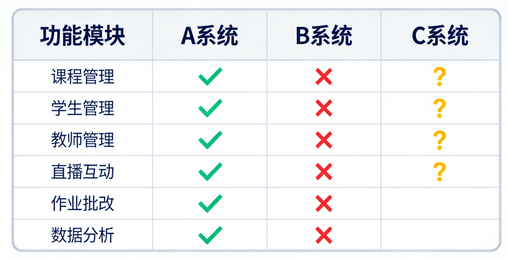 “网校系统怎么选?”——当您打开一个又一个网页,将A、B、C厂商的功能清单密密麻麻地填入Excel表格时,您是否意识到,您可能根本不是在“选择”,而是在“妥协”?您在妥协于大同小异的功能,妥协于模糊不清的差异,最终妥协于一个“看起来都差不多”的决定。